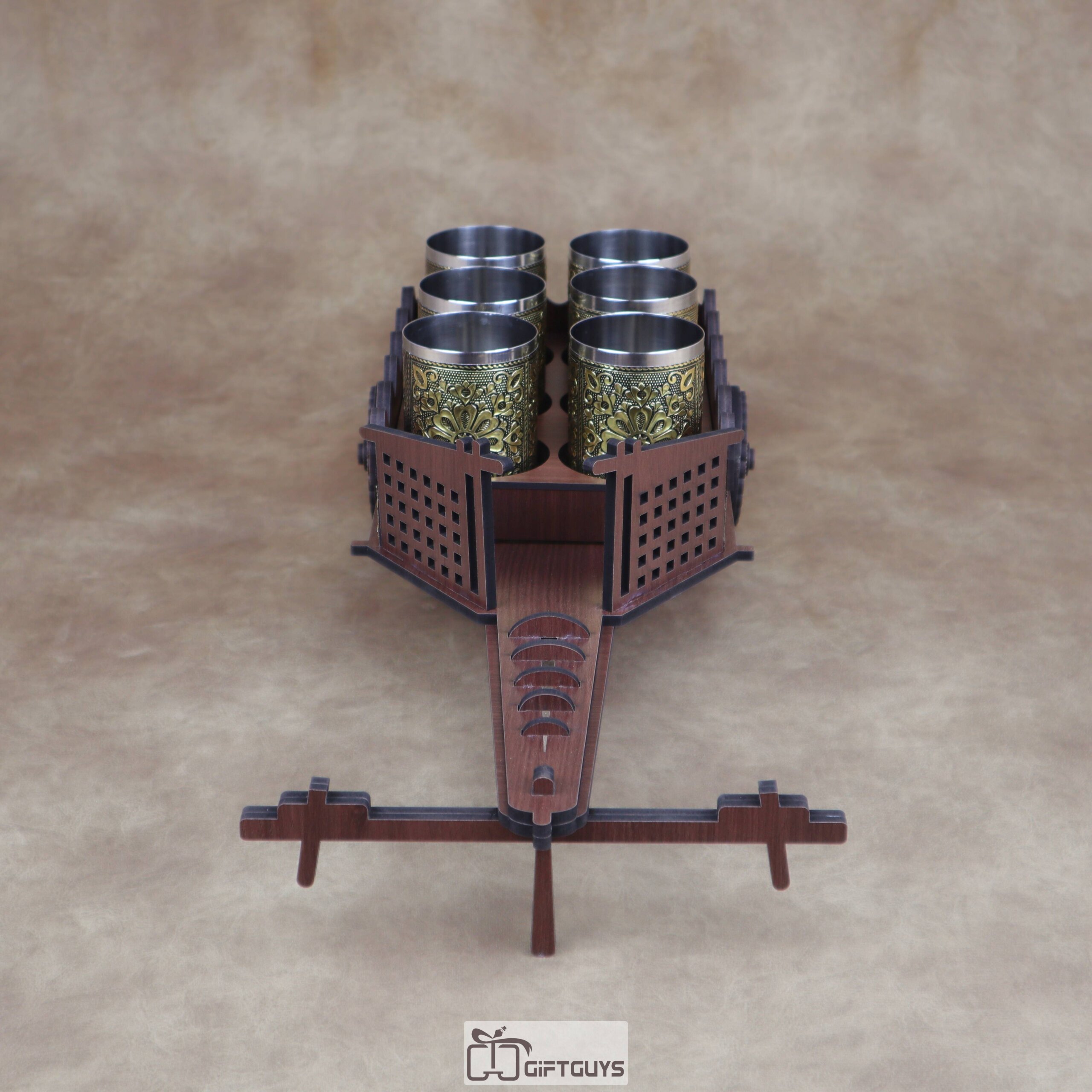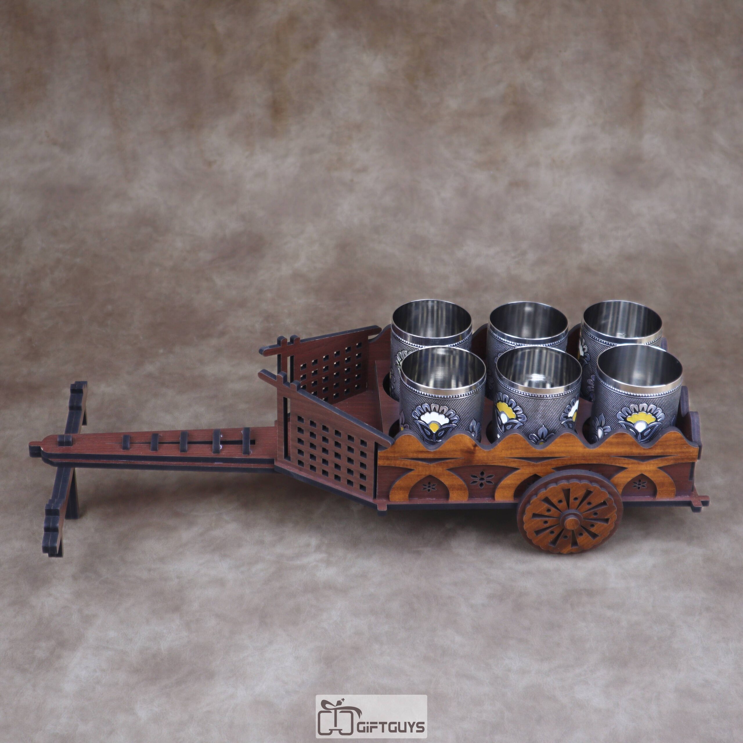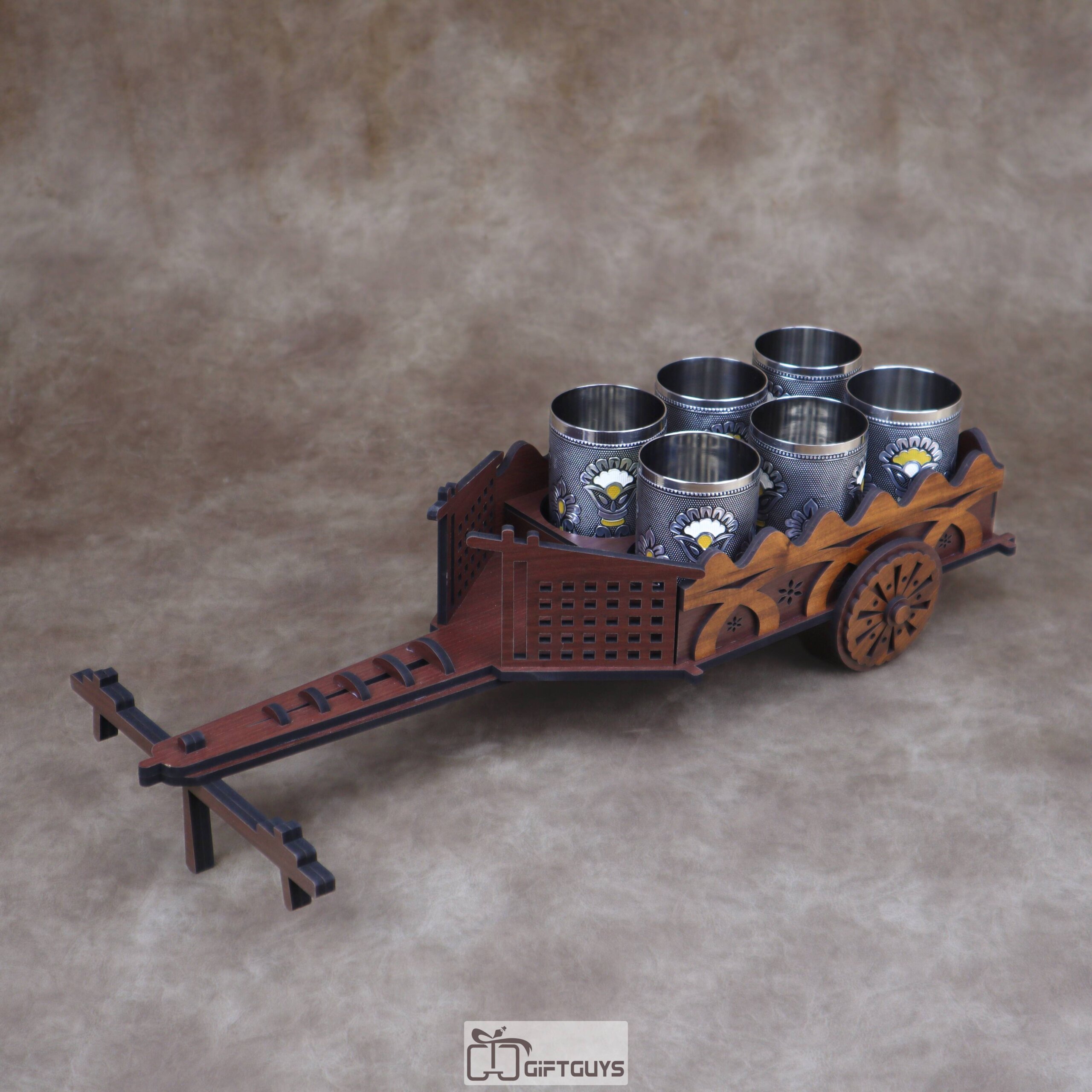 Traditional Wooden Bullock Cart Serving Tray with 6 Designer Stainless Steel Glasses | Ethnic Barware Gift