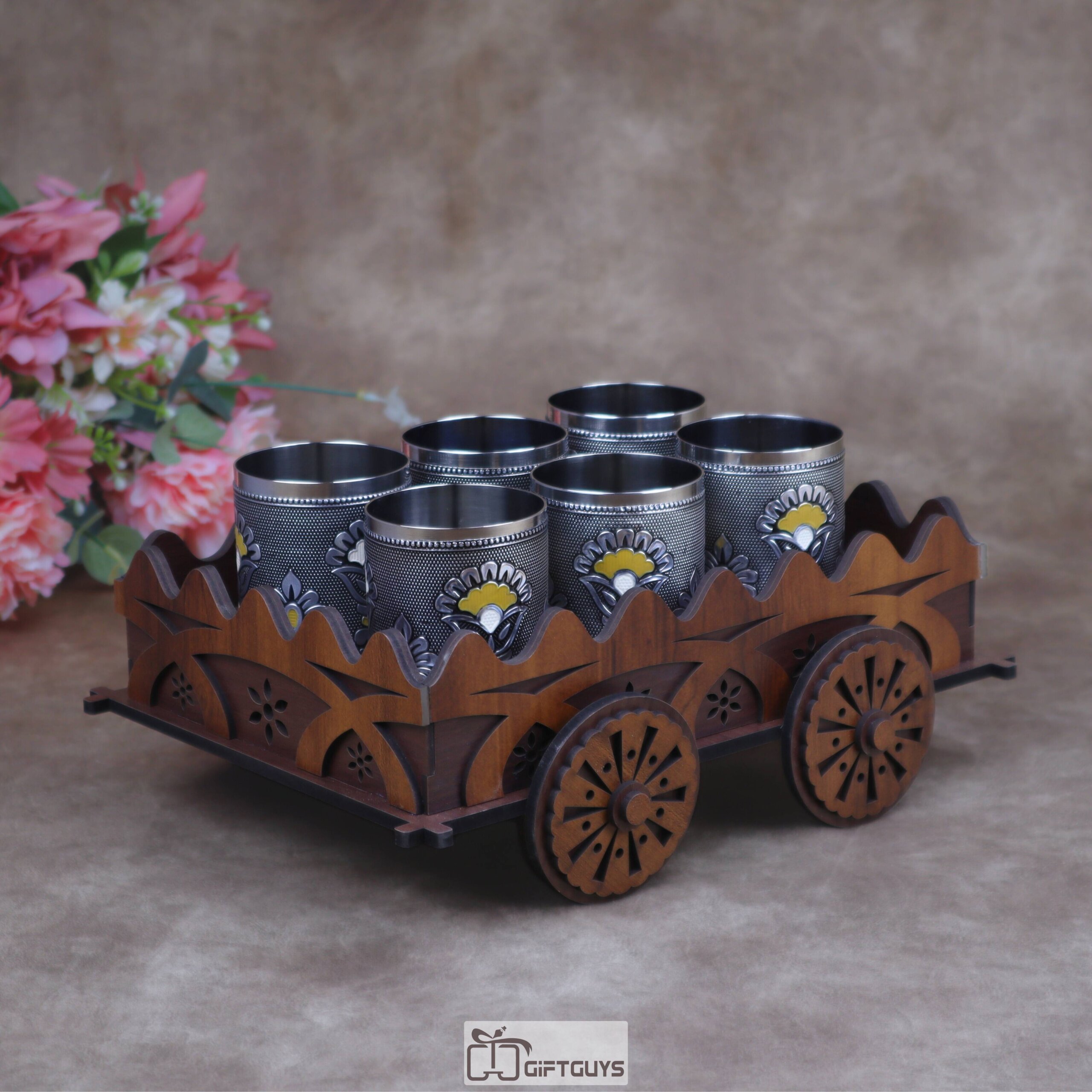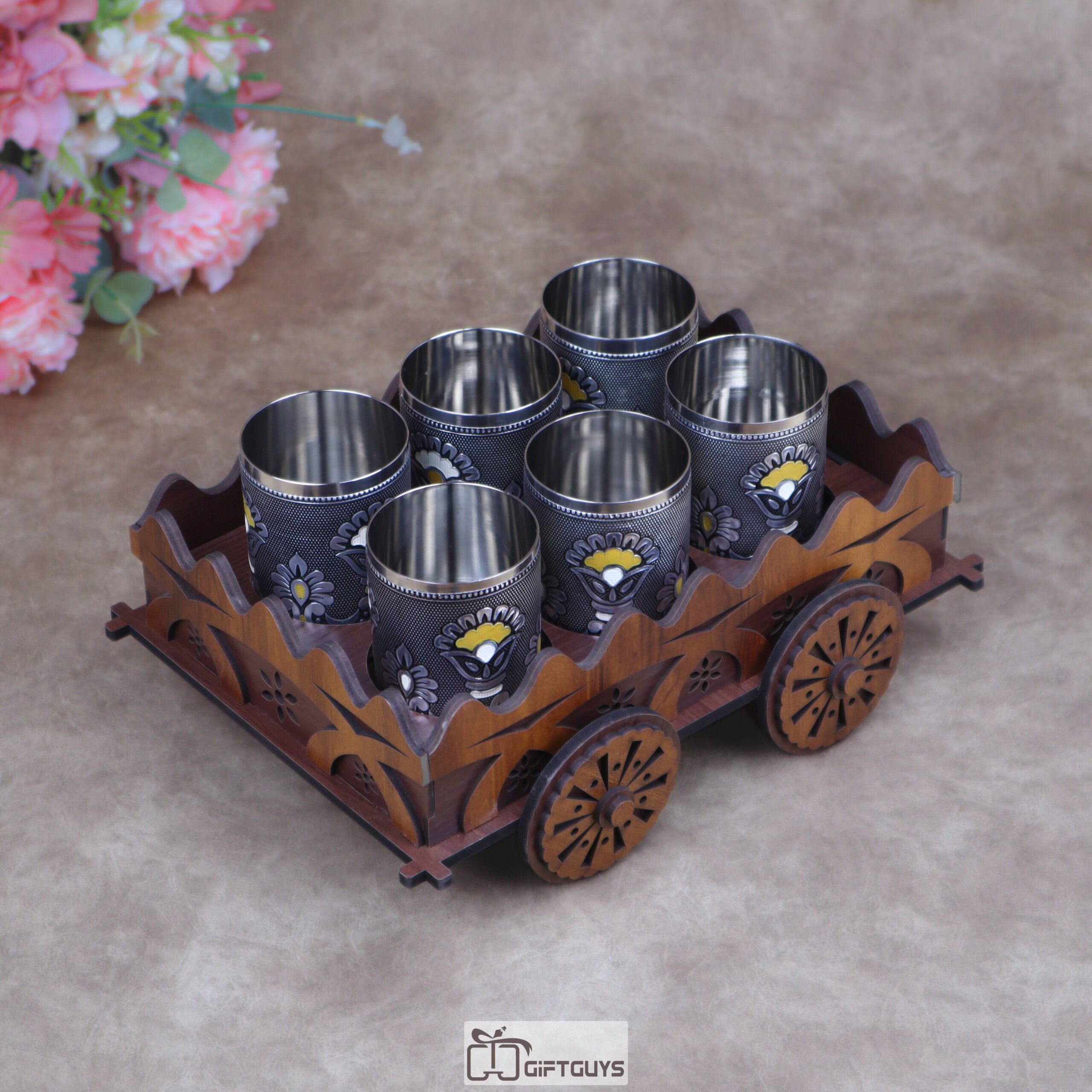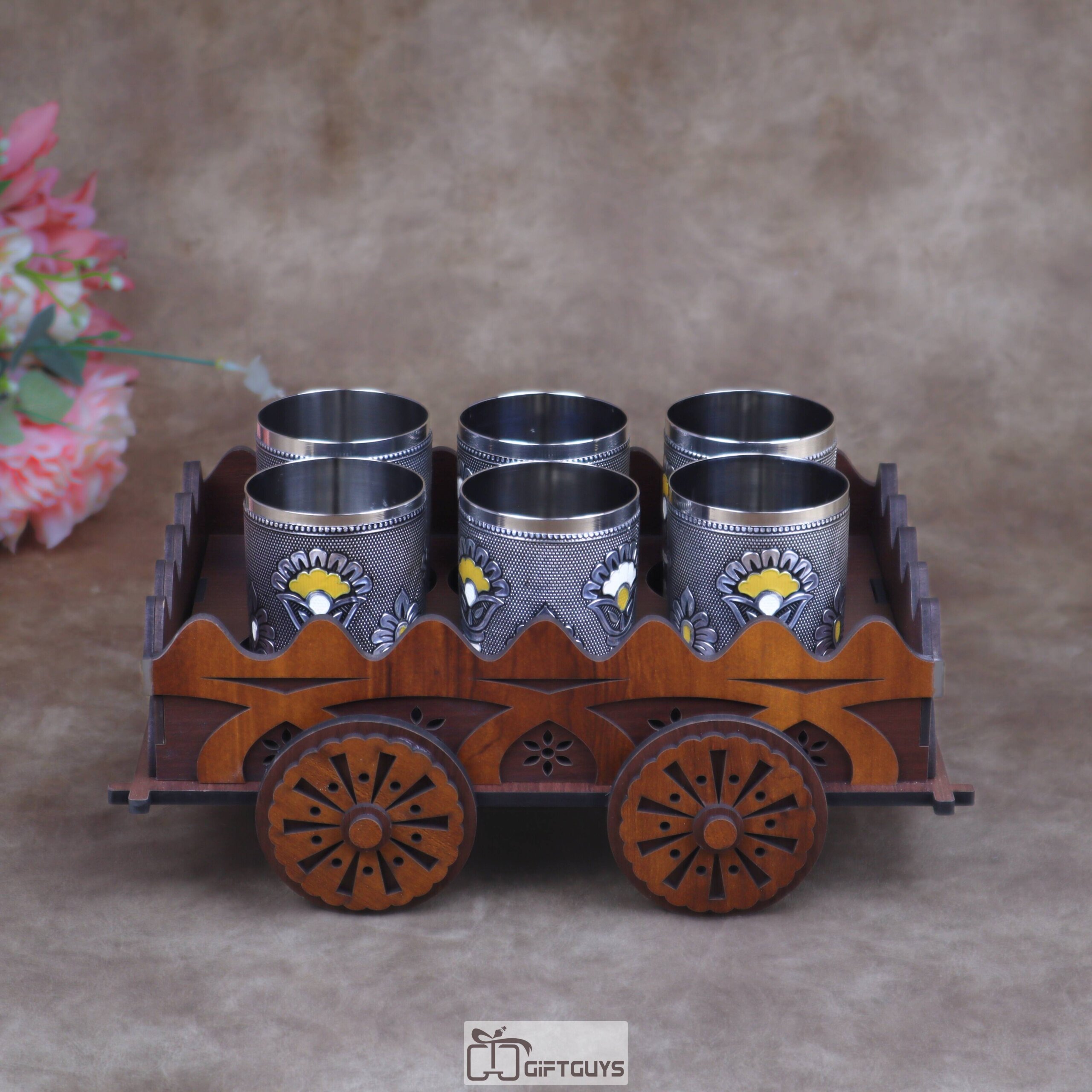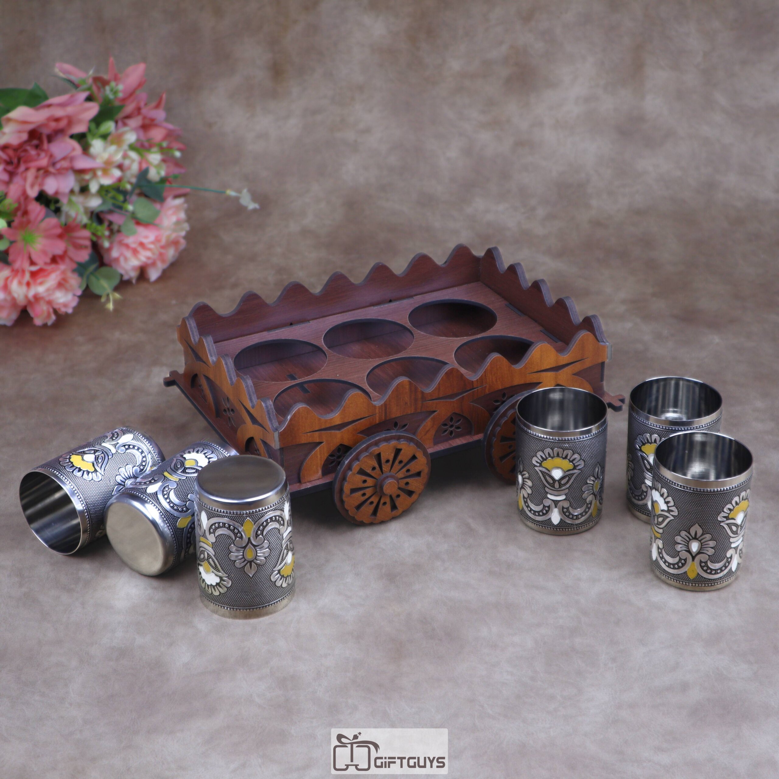 Traditional Wooden Cart Bar Serving Set with Hand-Painted Meenakari Steel Glasses ( Set of 6 Glass )