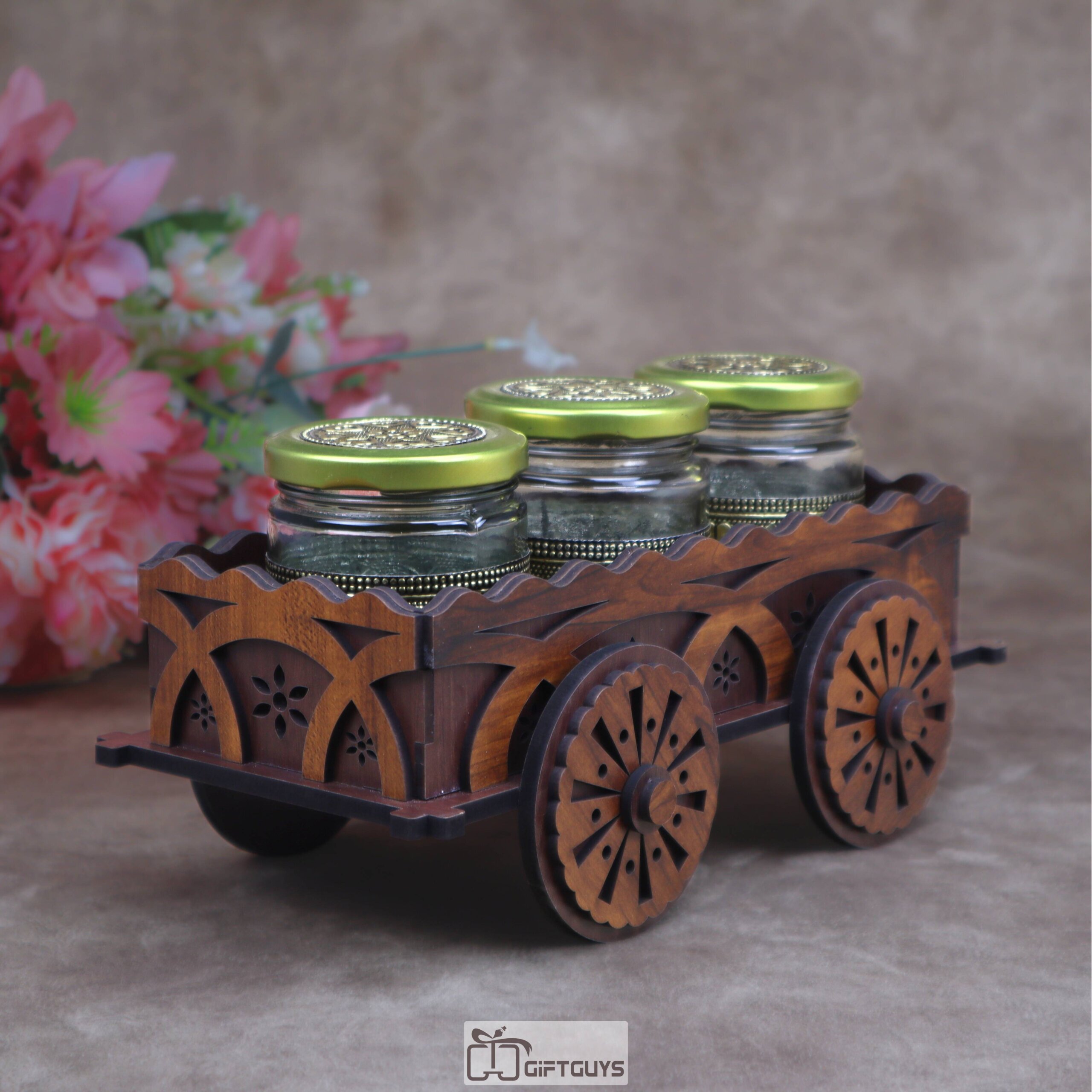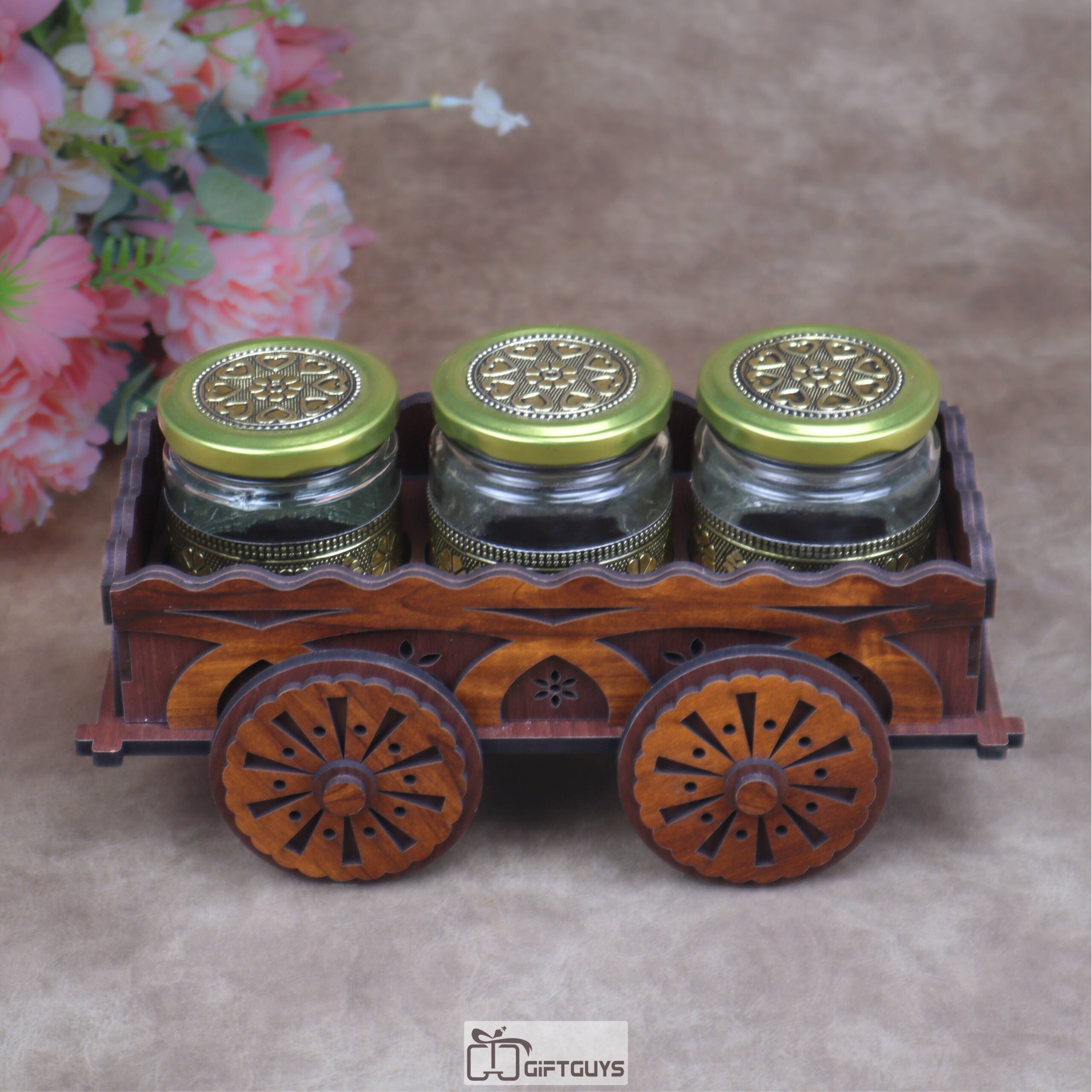 Traditional Wooden Cart Serving Tray With Oxidised Glass Jars for Dry Fruits & Condiments | Mid-Size Ethnic Gift ( Set Of 3 Jar )