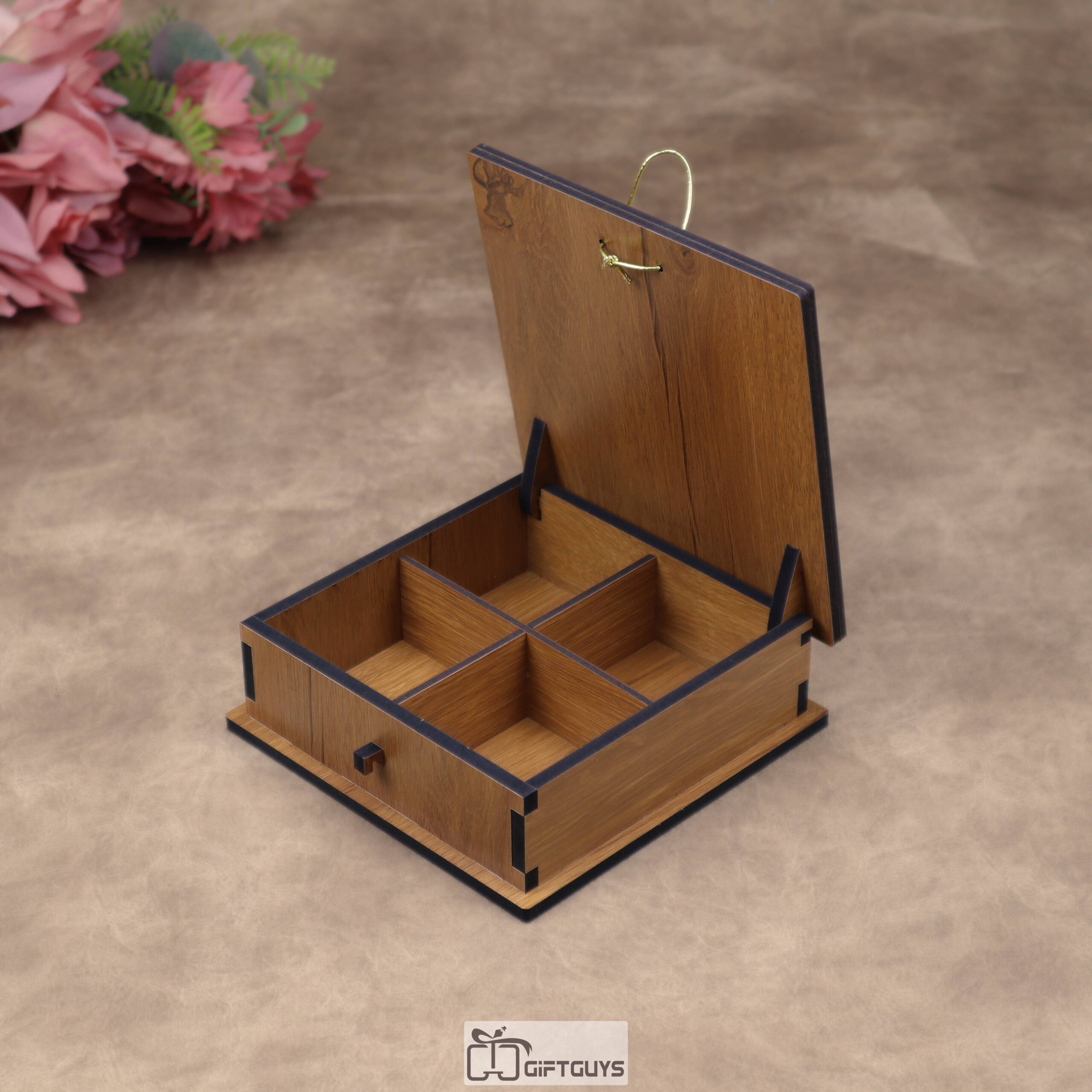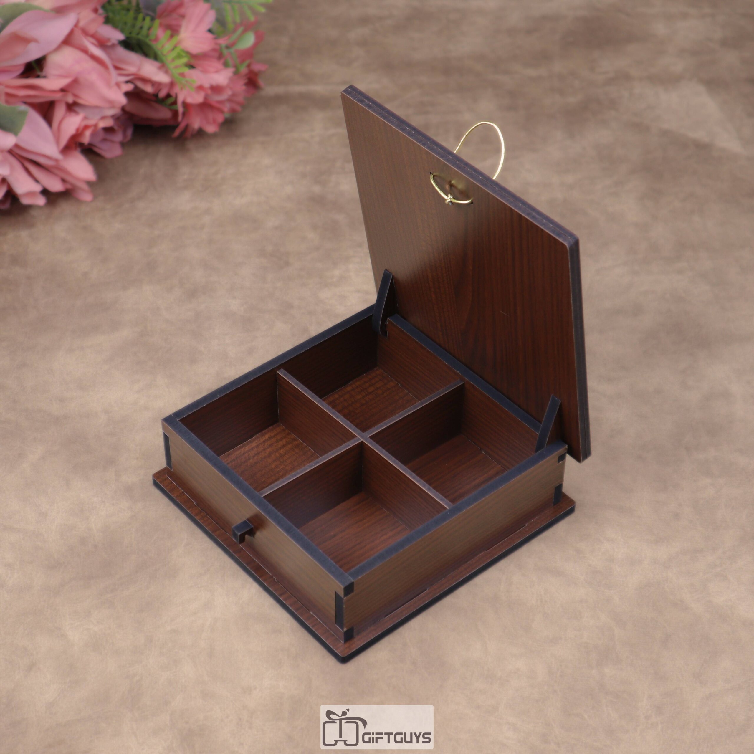 Wooden Dry Fruit Box with 4 Compartments | Decorative Chocolate & Gift Box – 6x6x2 Inch