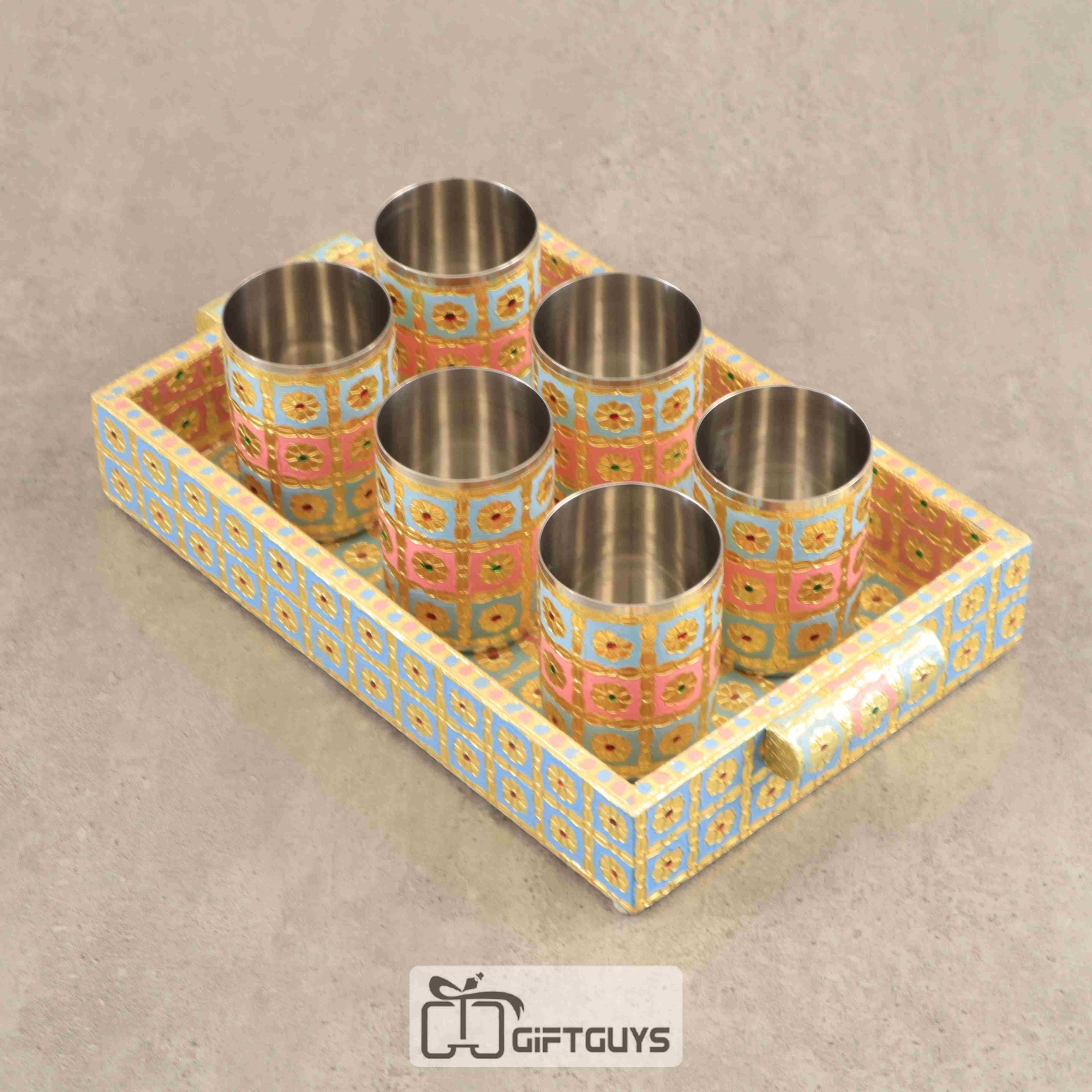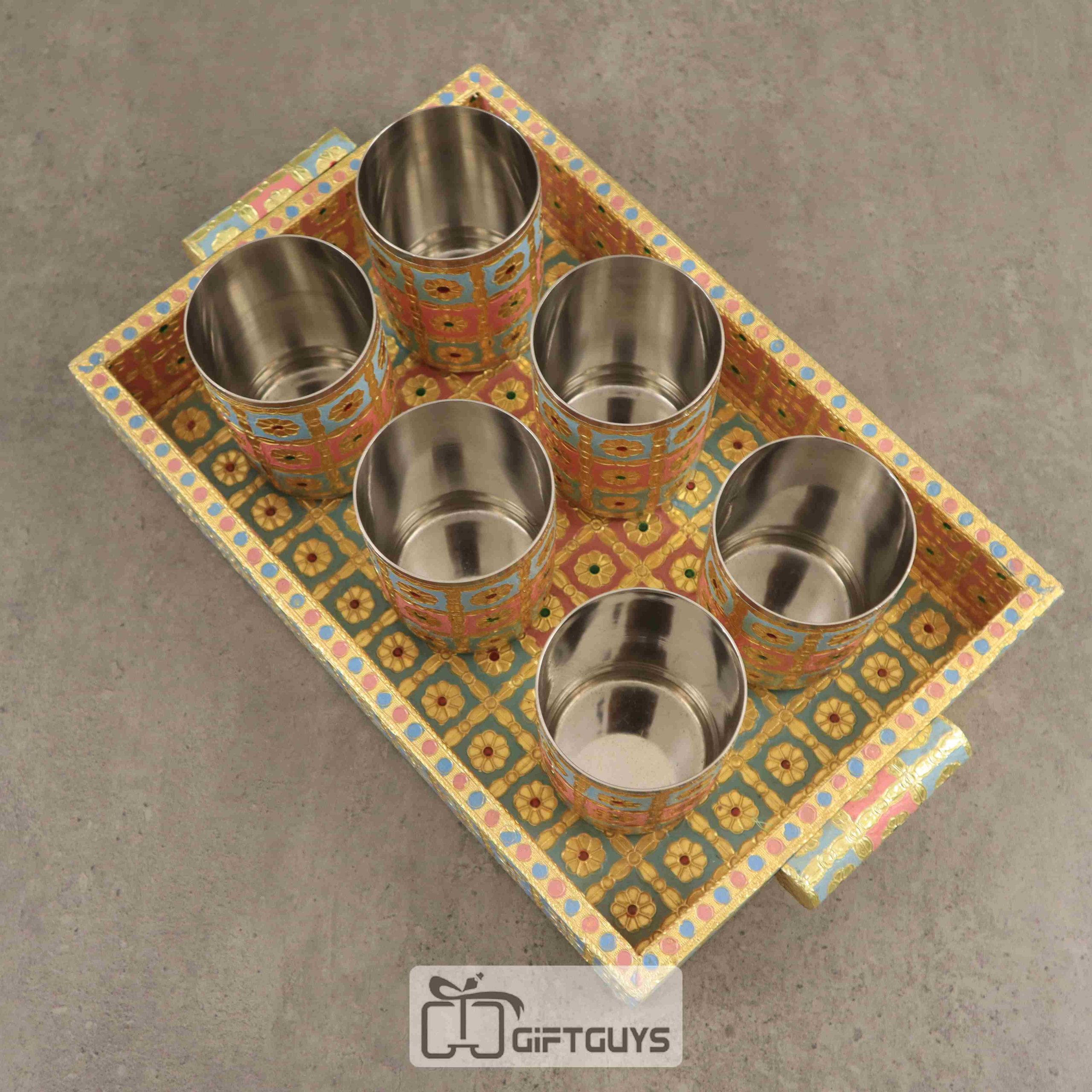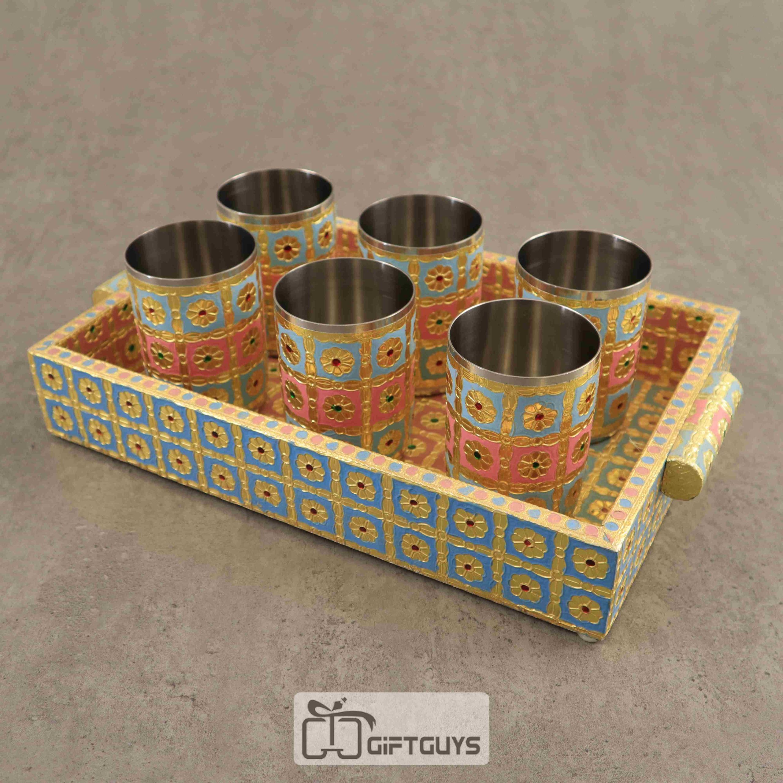 Wooden Meenakari Tray With 6 Glass