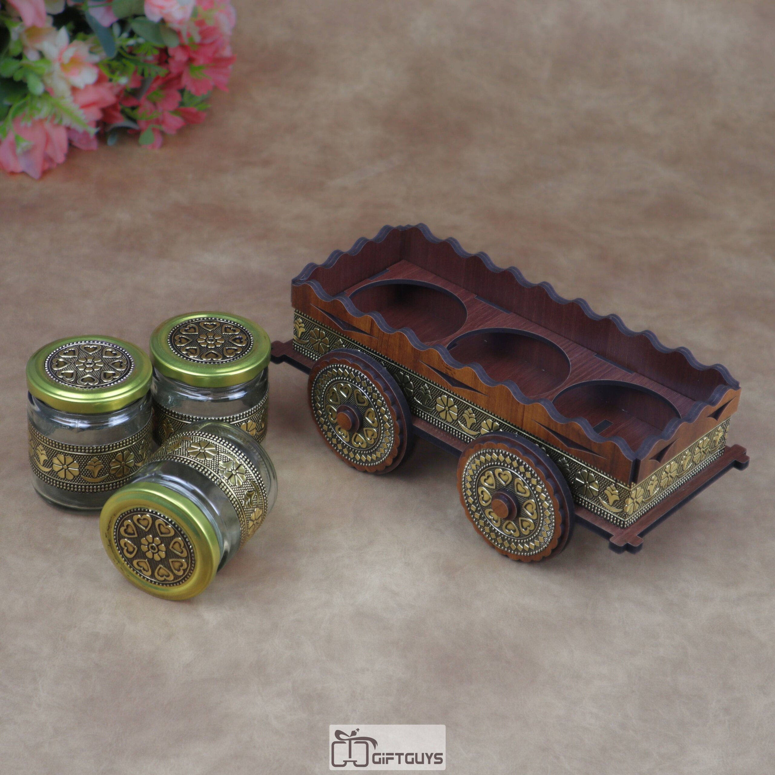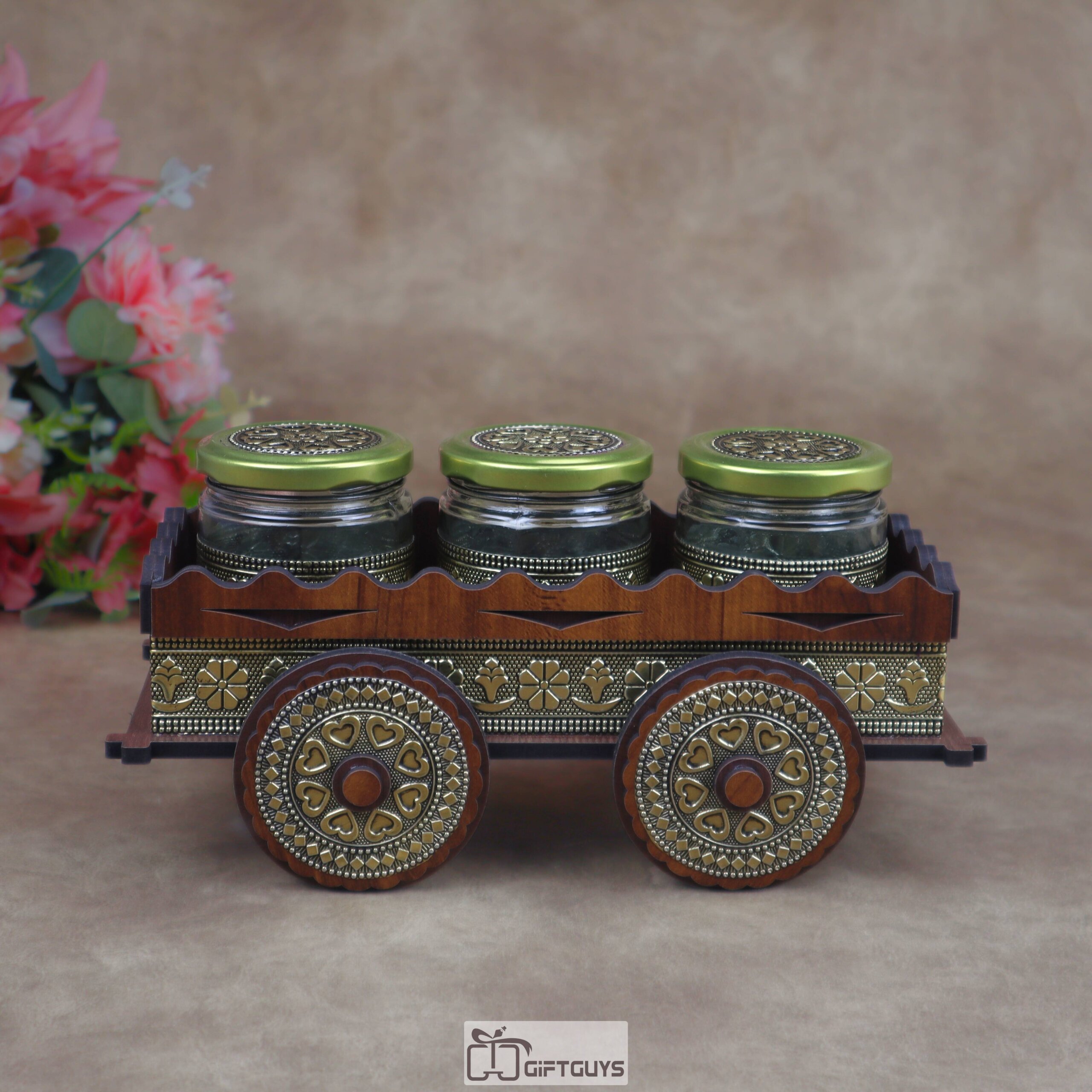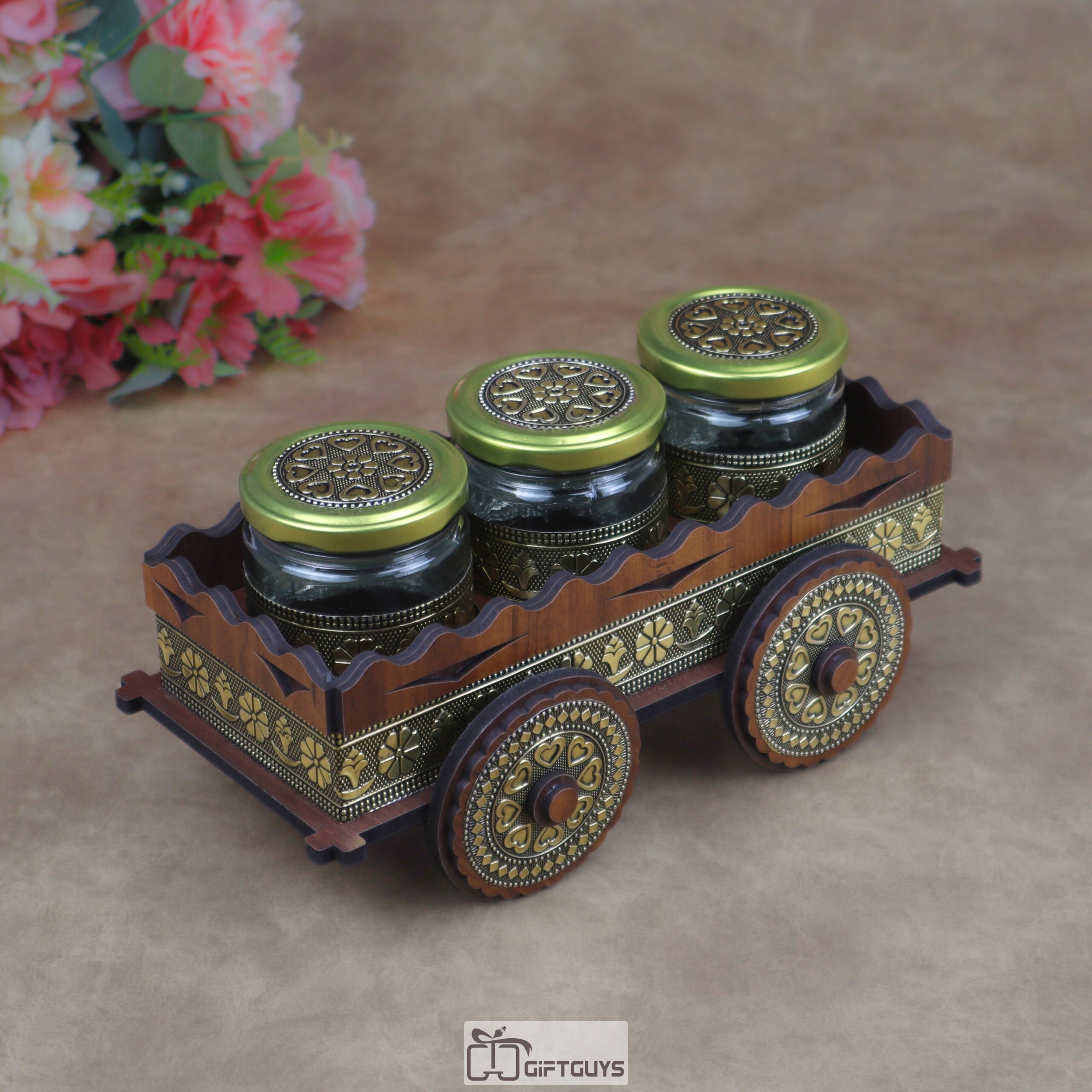 Wooden Oxidised Cart Dry Fruit/Spice Serving Set With Antique Oxidised Glass Jars | Festive Kitchen Decor Gift ( Set of 3 Jars )