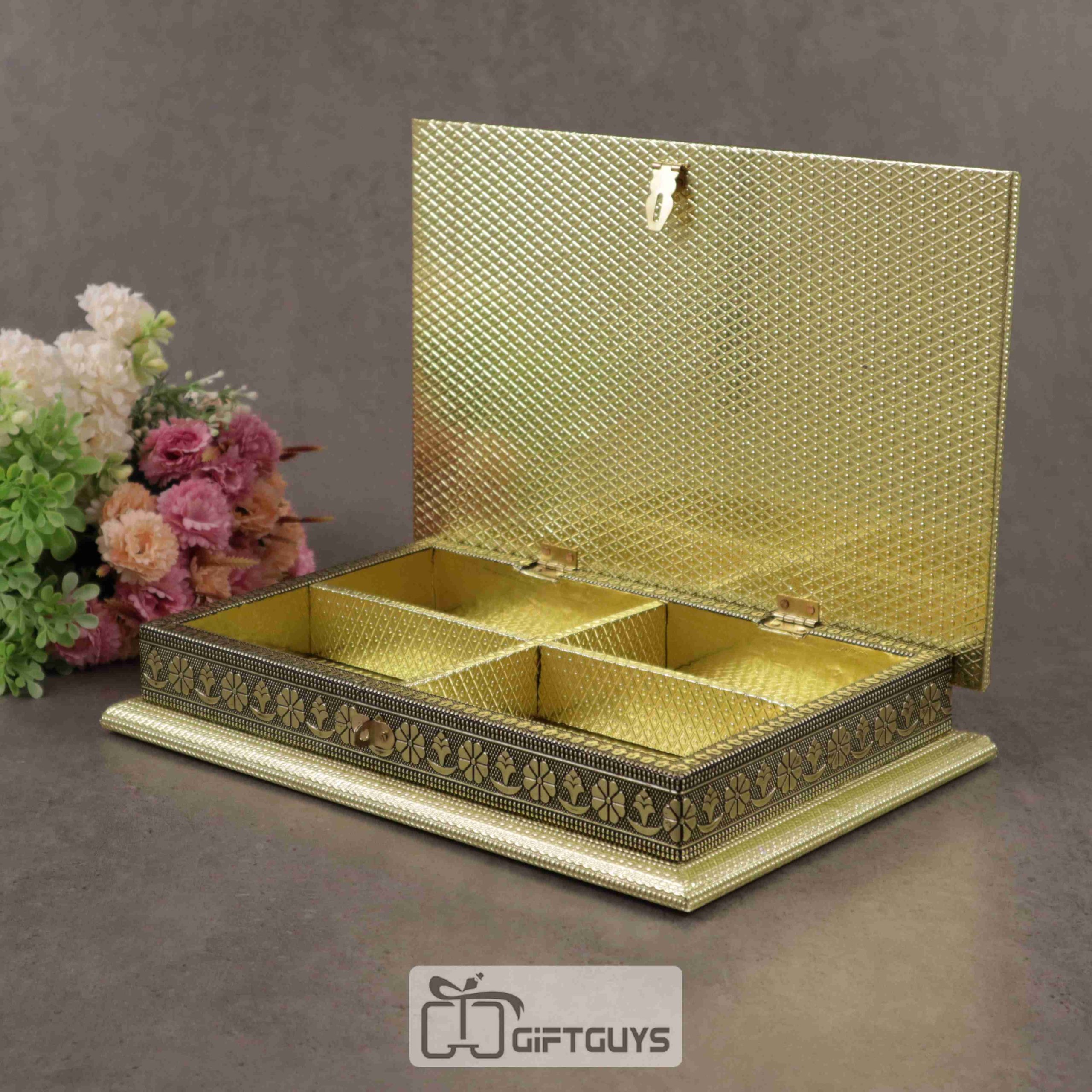 Generous 12×8 inch size with 4 compartments – ideal for dry fruits, sweets, or small treasures.