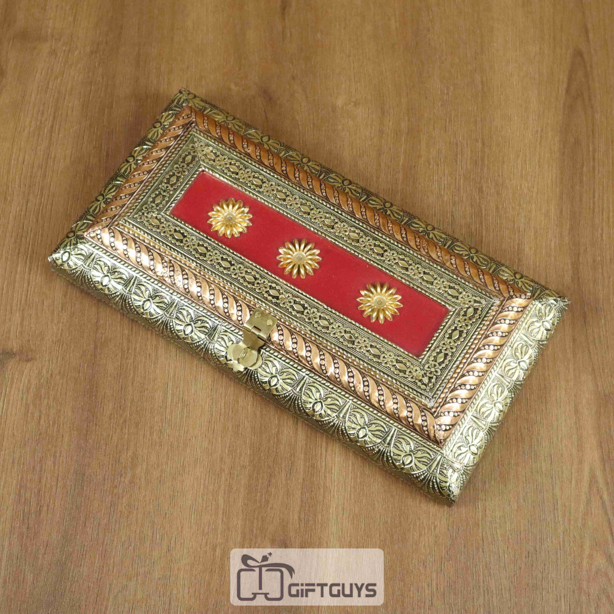 🔸 Elegant Craftsmanship – Features embossed oxidised metal borders with a rich red velvet top and intricate motifs.