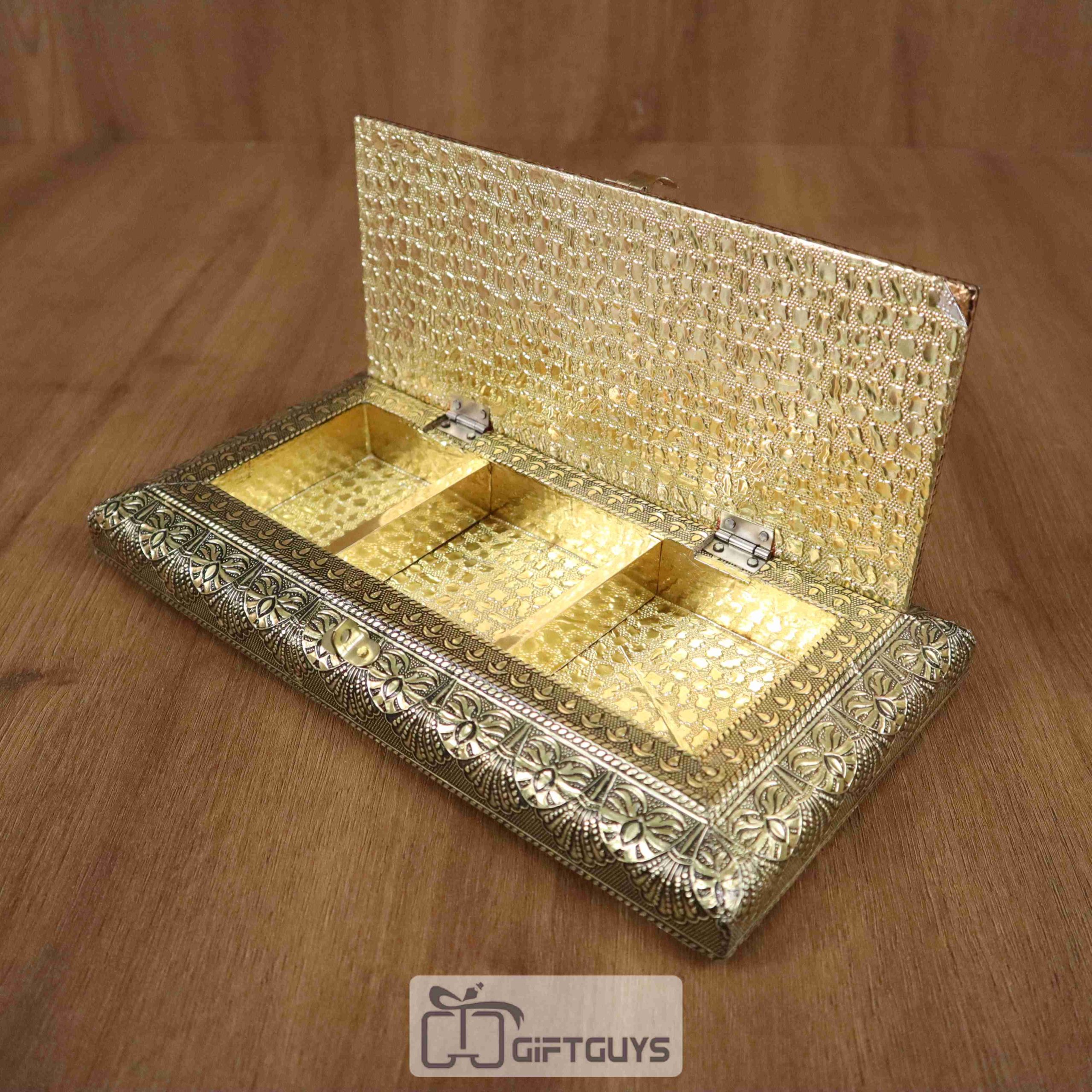 🔸 Spacious Interior – Comes with 3 golden compartments – perfect for dry fruits, sweets, or chocolates.