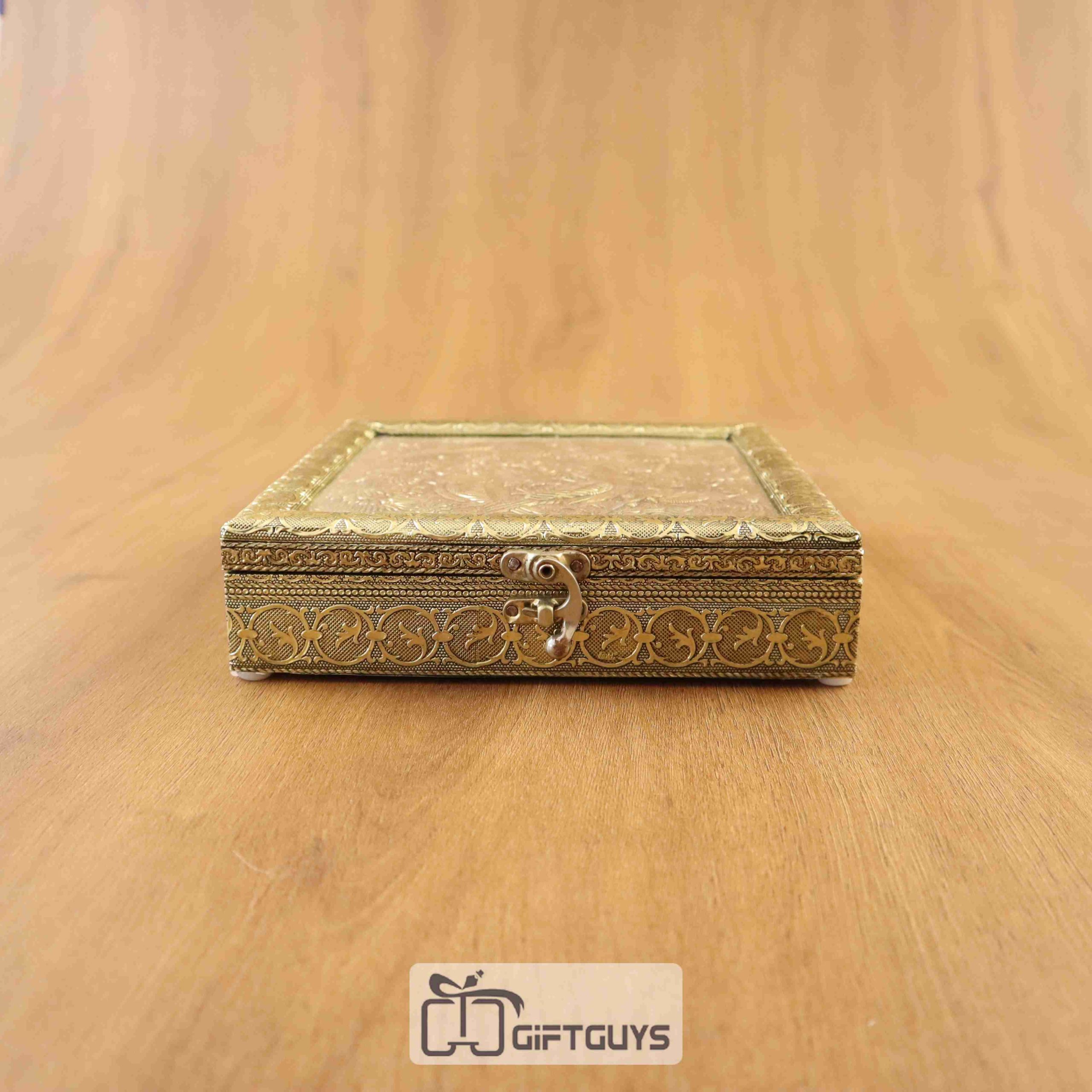 Oxidised golden dry fruit box with embossed royal Sparrow design and 4 compartments – ideal for festive and premium gifting.