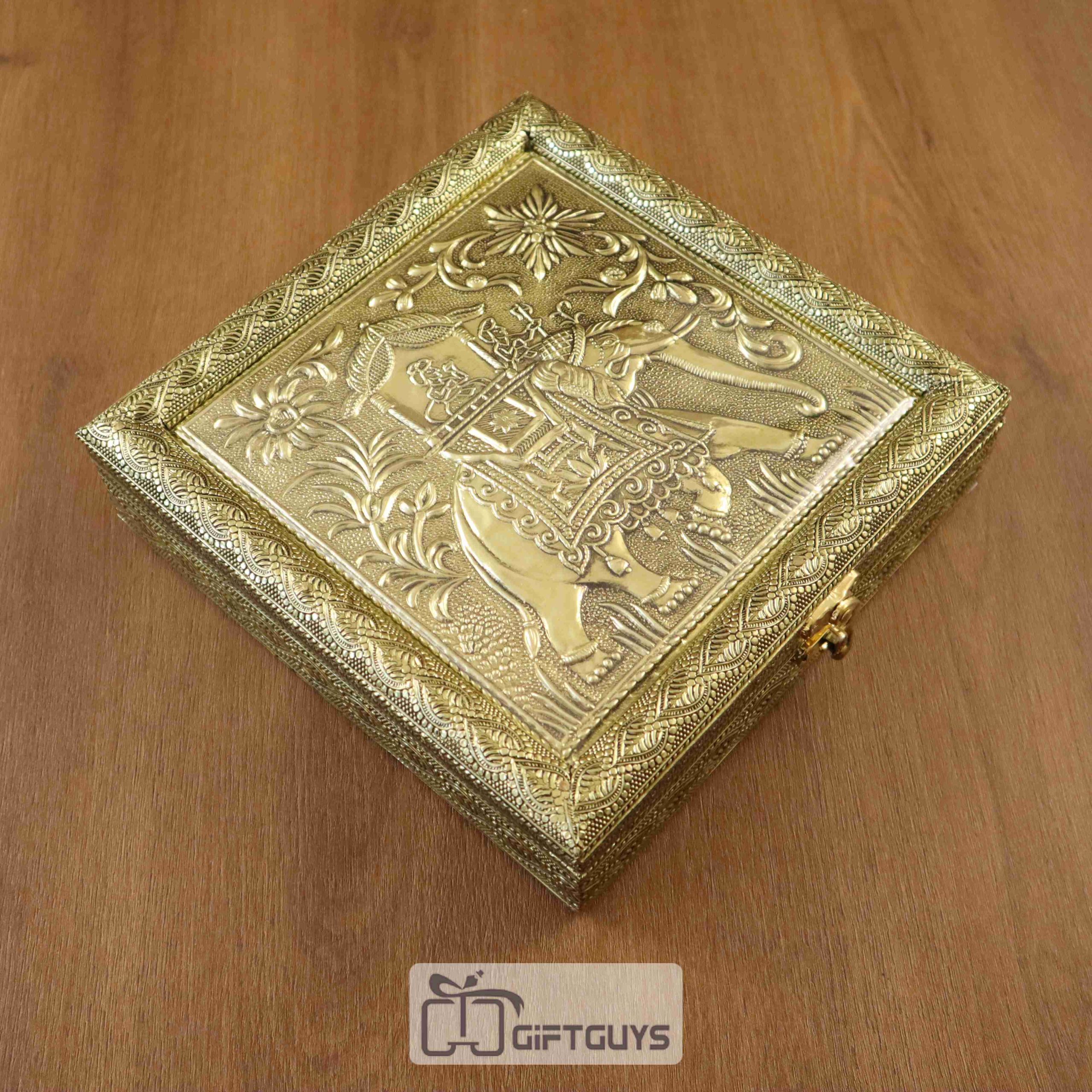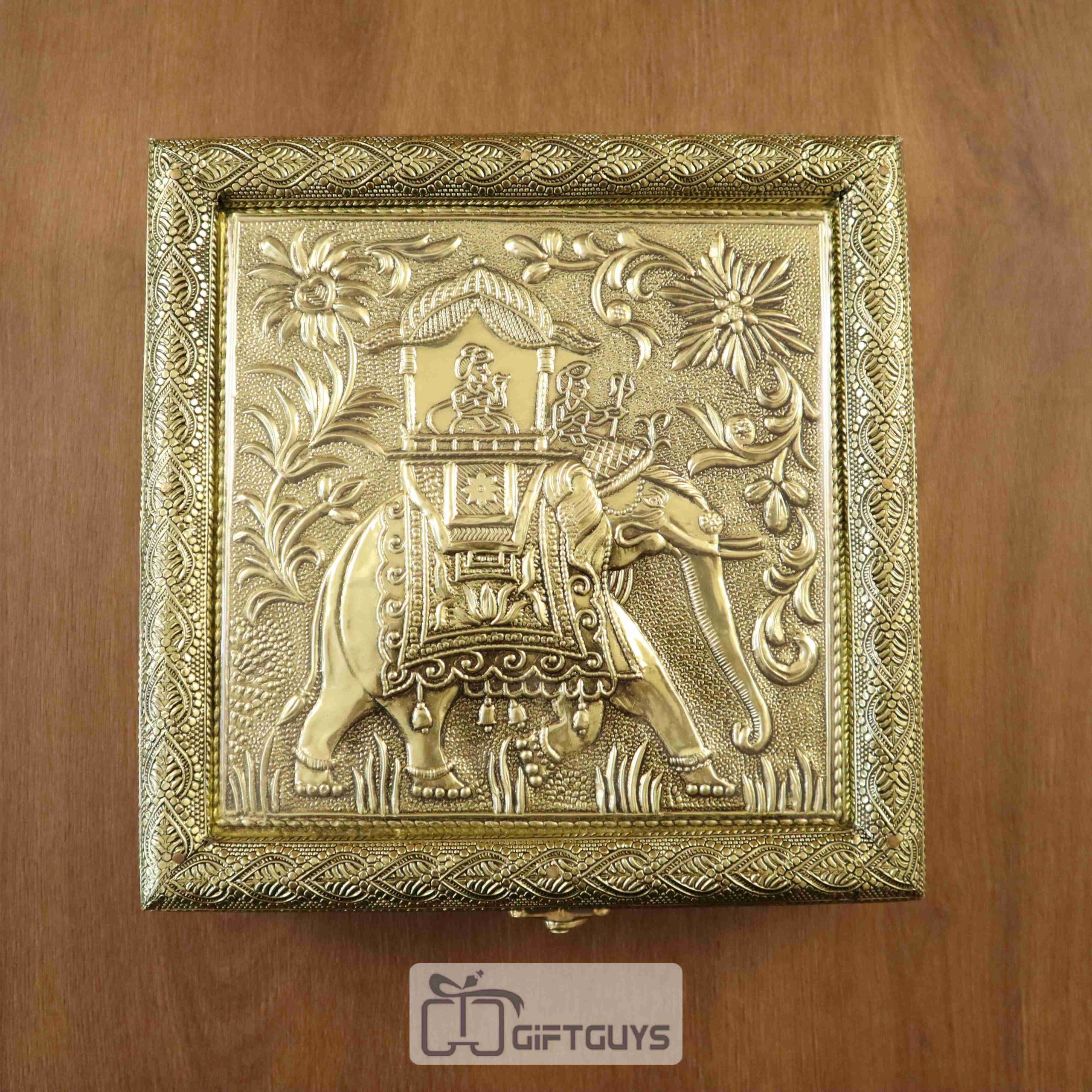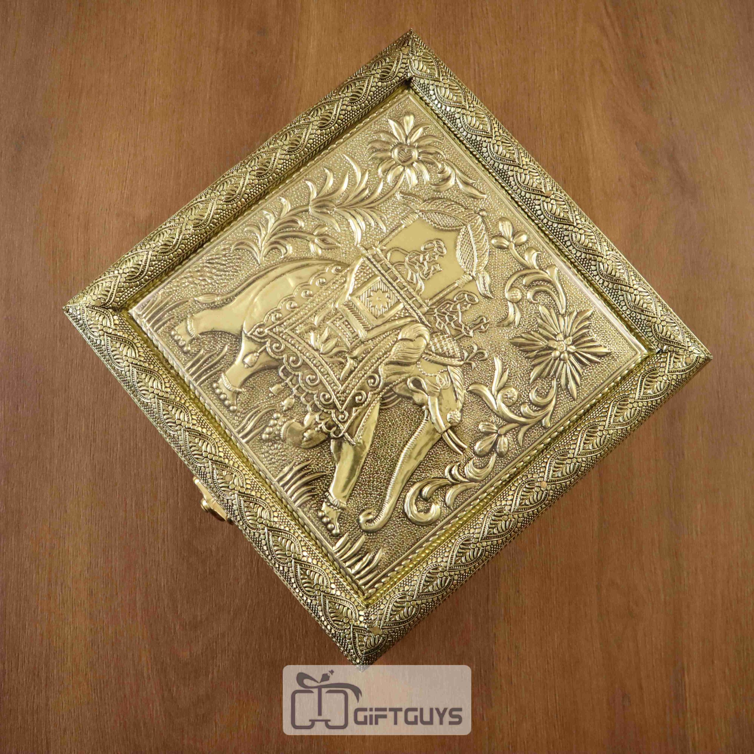 Oxidised golden dry fruit box with embossed royal elephant design and 4 compartments – ideal for festive and premium gifting.