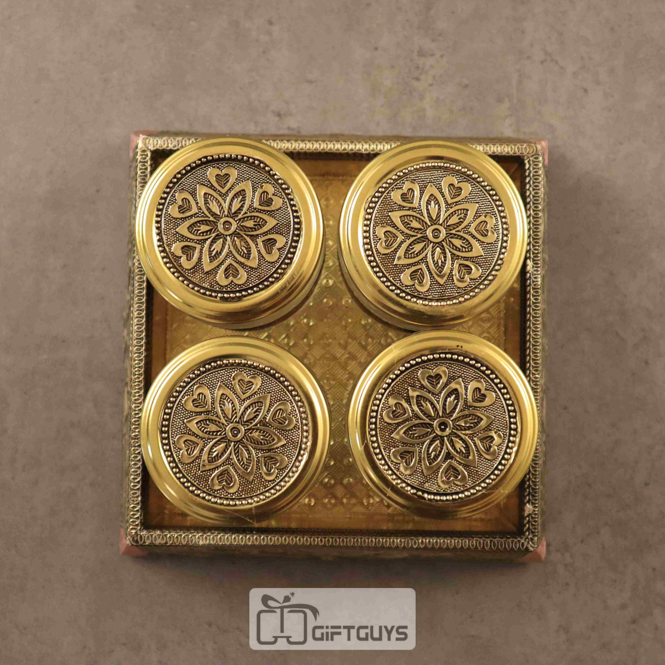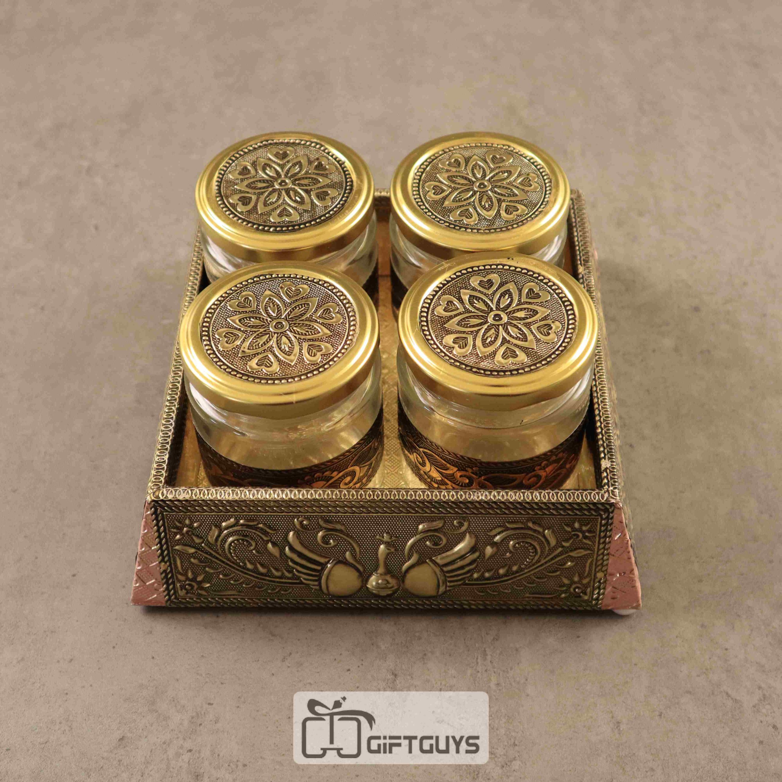 🔸 Set of 4 Elegant Jars – Glass jars with embossed metal lids and ornamental banding, perfect for dry fruits, spices, or condiments.