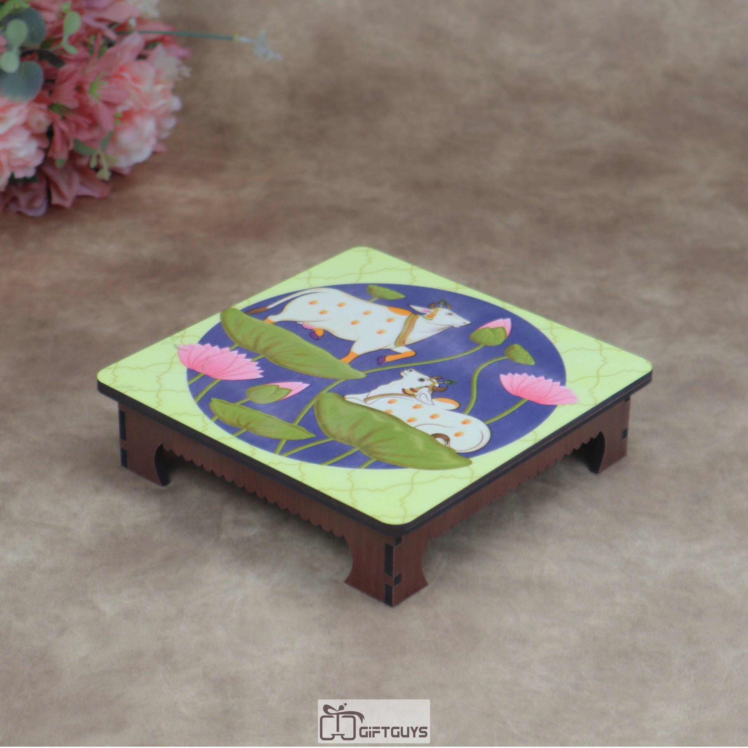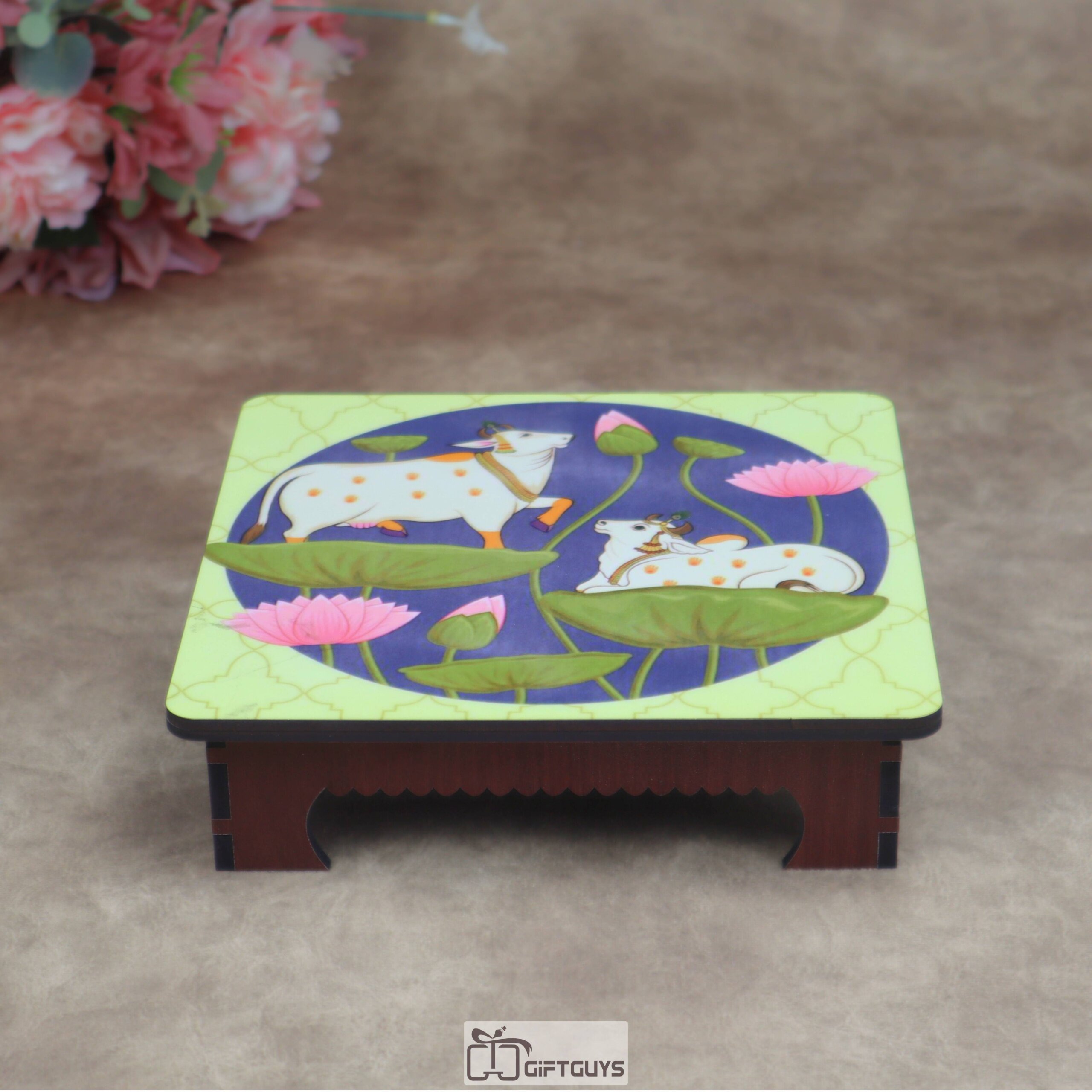 Wooden Printed Pichwai Cow & Lotus Chowki (Small) | Auspicious Decorative Puja Platform