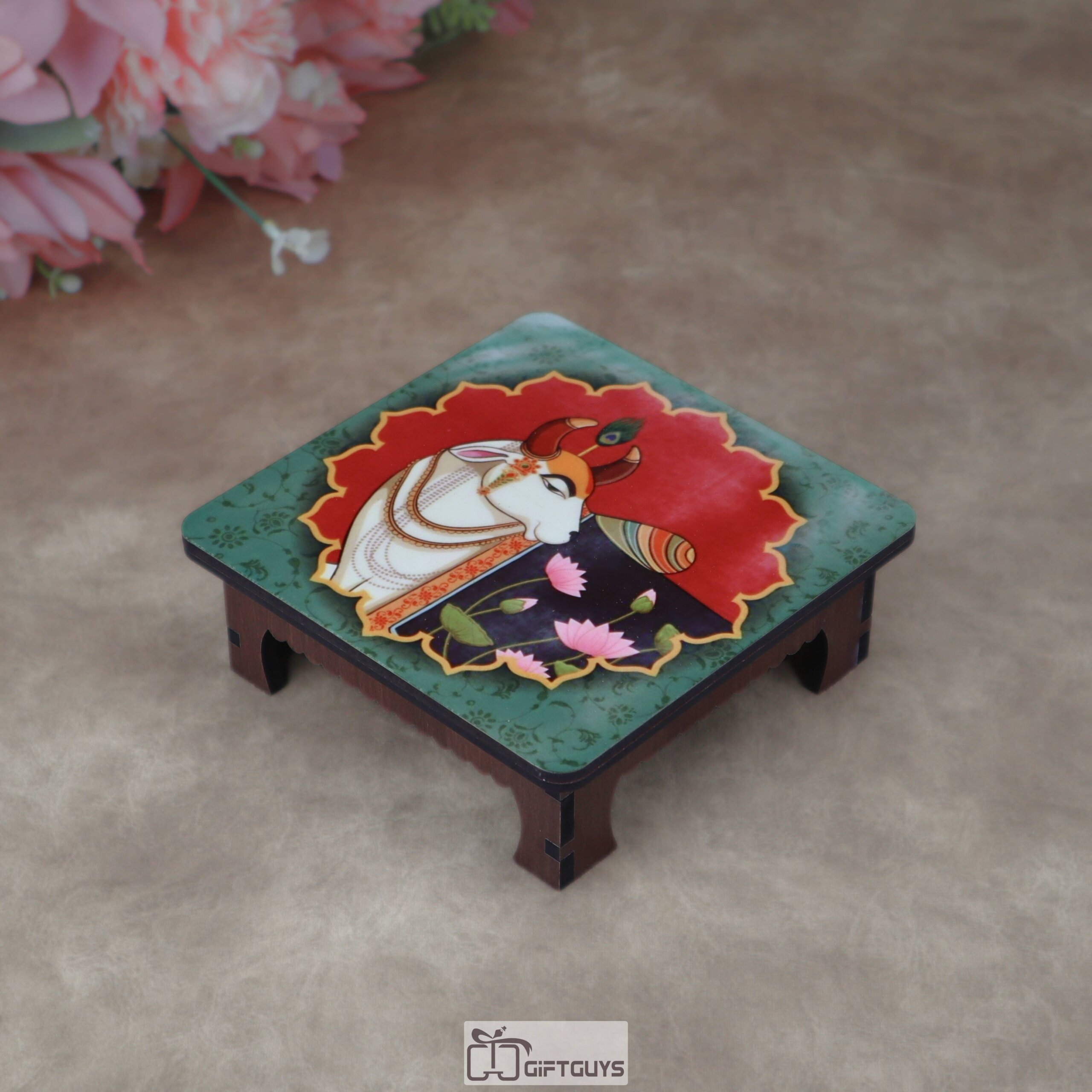 • Auspicious Decor: 🌟 The cow and lotus motifs are highly auspicious in Hindu traditions, making this chowki ideal for festivals and religious ceremonies.