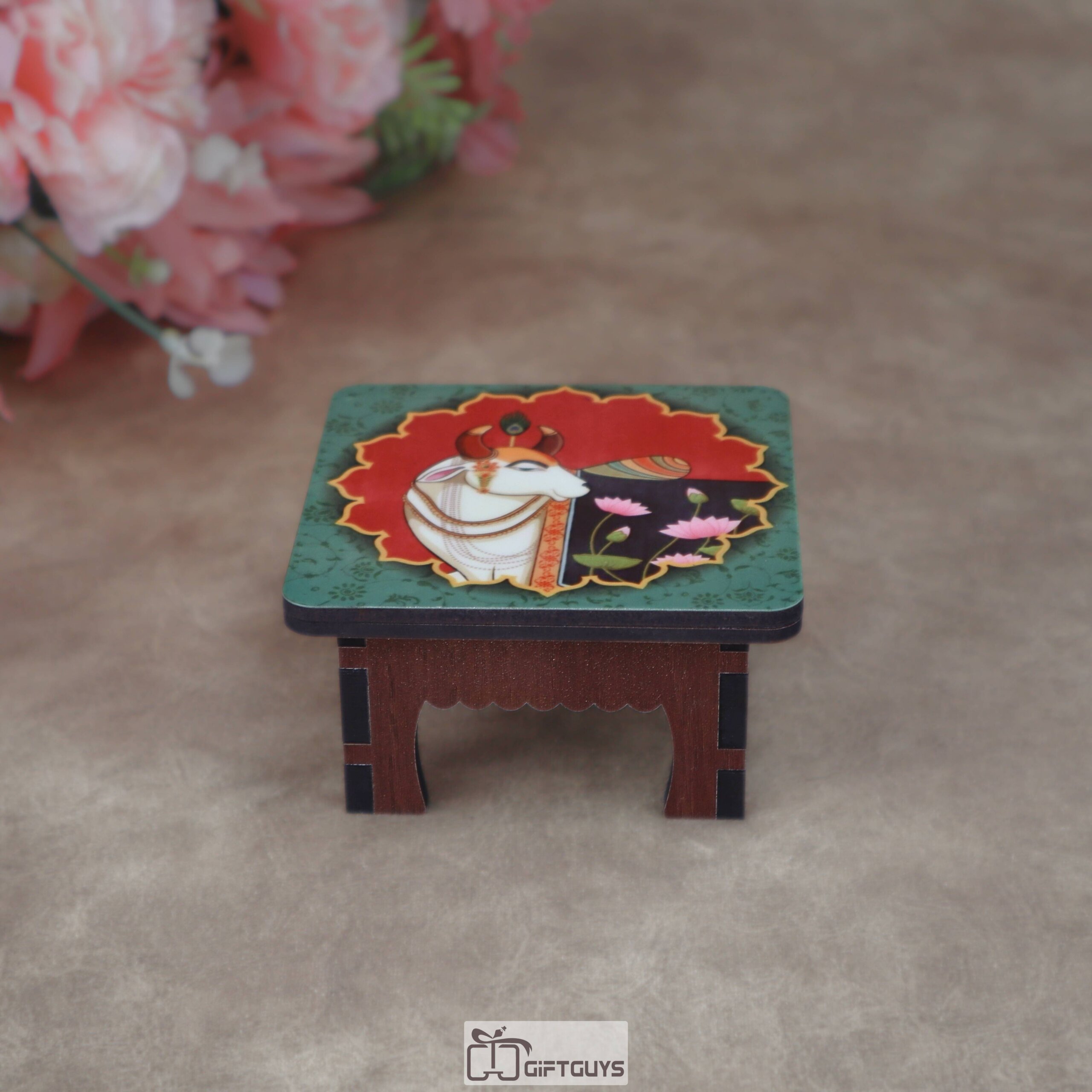 Wooden Printed Chowki – Pichwai Cow & Lotus