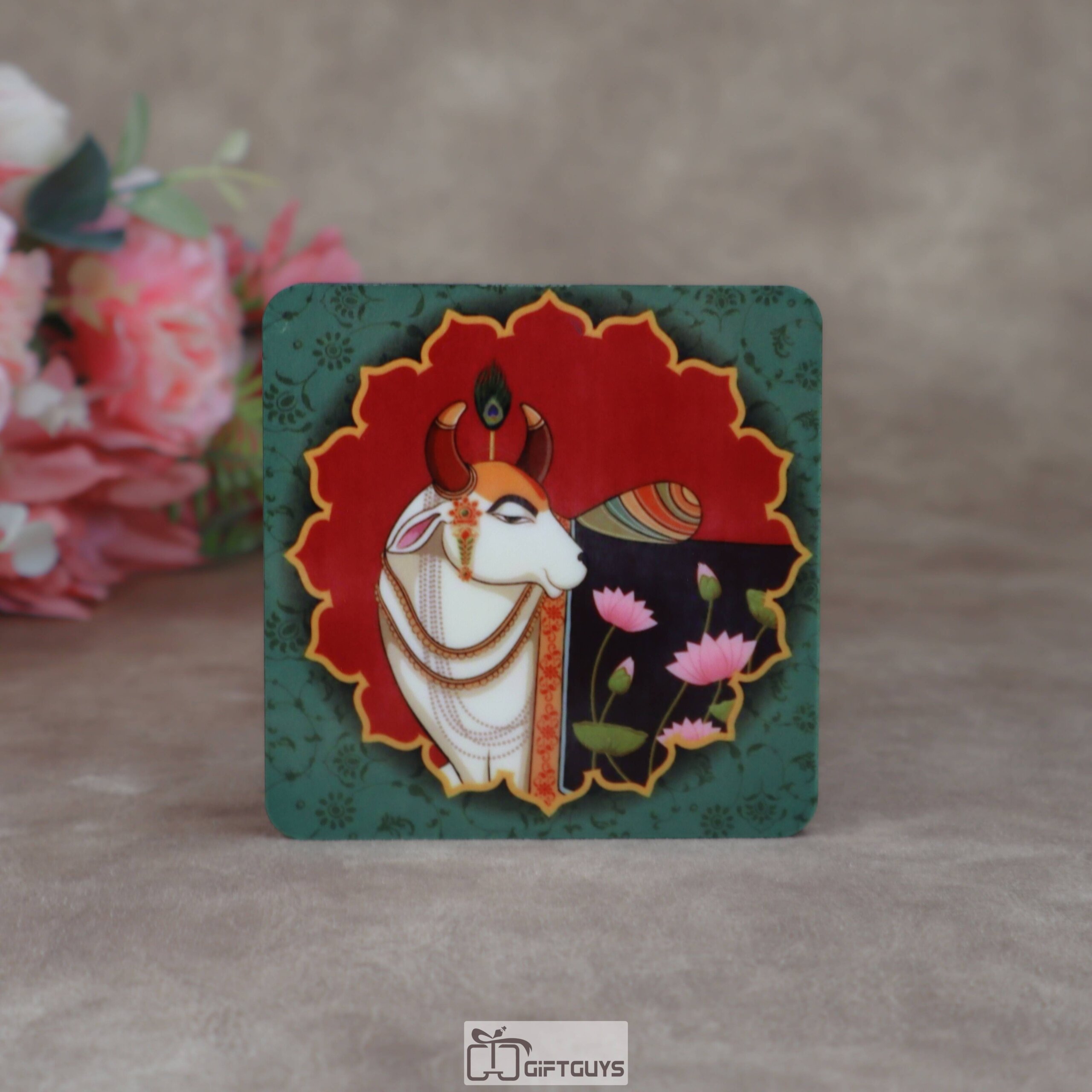 • Traditional Pichwai: 🎨 The surface showcases a beautiful digital print inspired by Pichwai art, depicting divine spotted cows (Kamdhenu) among lush green lotus leaves and pink blossoms.